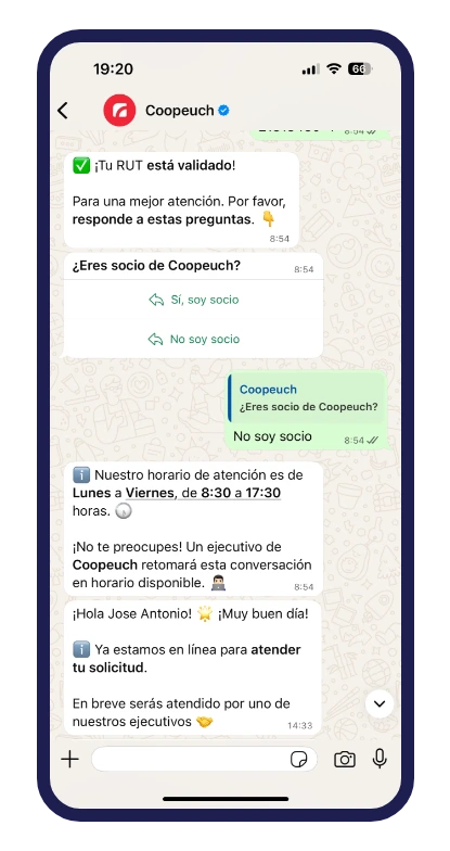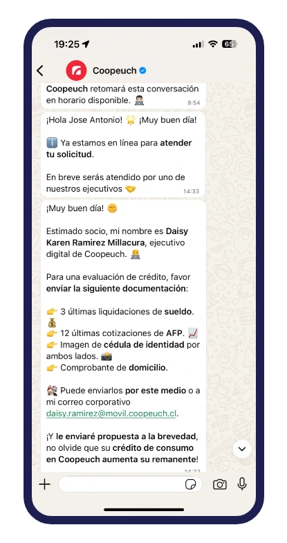 Para Coopeuch, la solución conversacional está implementada tanto en WhatsApp.