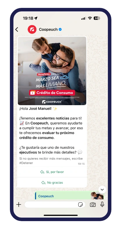 Mediante esta funcionalidad, se envían campañas informativas y promocionales que, en caso de despertar interés, permiten identificar y captar leads cualificados. Estos contactos son luego derivados a la red de ejecutivos comerciales de Coopeuch. El resultado es una sinergia efectiva entre automatización y fuerza comercial, optimizando el funnel de conversión y mejorando la eficiencia del equipo de ventas.