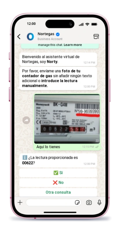 Se implementó un sistema innovador de Reconocimiento Óptico de Caracteres (OCR). Los usuarios pueden enviar simplemente una foto de su contador por WhatsApp y el sistema identifica la lectura, se la presenta para su validación e inmediatamente la registra en los sistemas de Nortegas, simplificando drásticamente el proceso de Aportación de Lecturas.