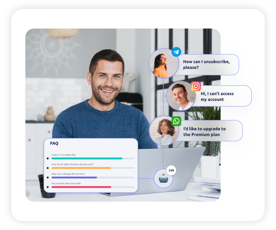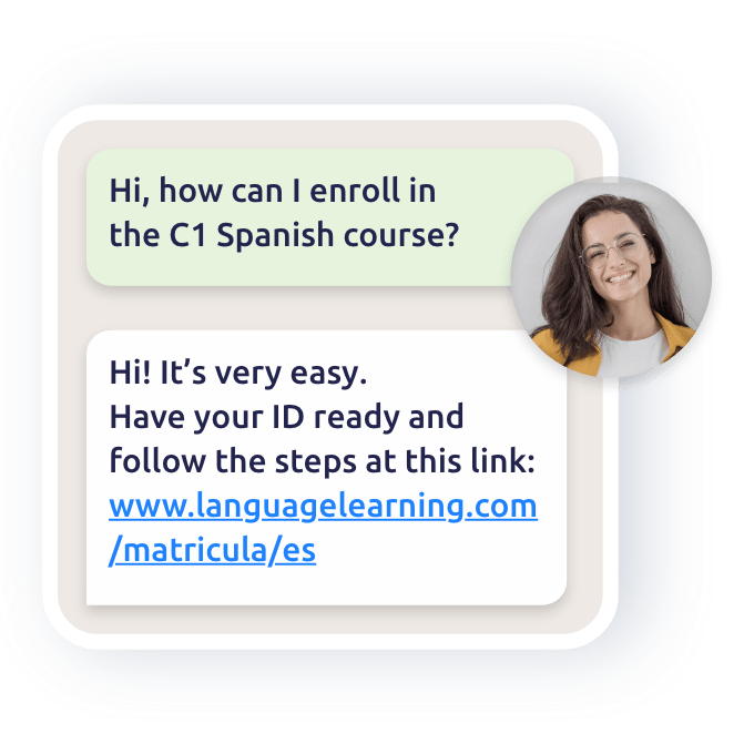 Our chatbot can solve any frequent doubts you have documented: schedules, prices, policies, steps to hire, requirements, common incidents… We train it with your own content so that it always has the right answer.