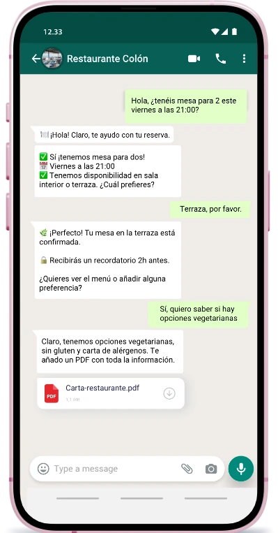 Claro. Nuestros agentes conversacionales funcionan en WhatsApp Business, Instagram, Facebook Messenger, web, app móvil y Google Business Messages. Así puedes atender reservas desde donde llegan tus clientes.