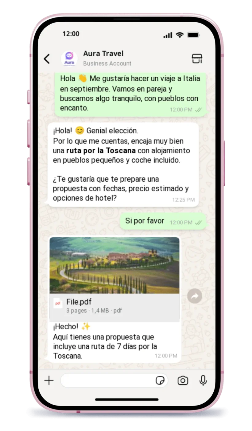 Preguntas sobre documentación, visados, políticas de equipaje o financiación se repiten cada día. La IA responde al instante y tu equipo se enfoca en ventas de mayor valor.